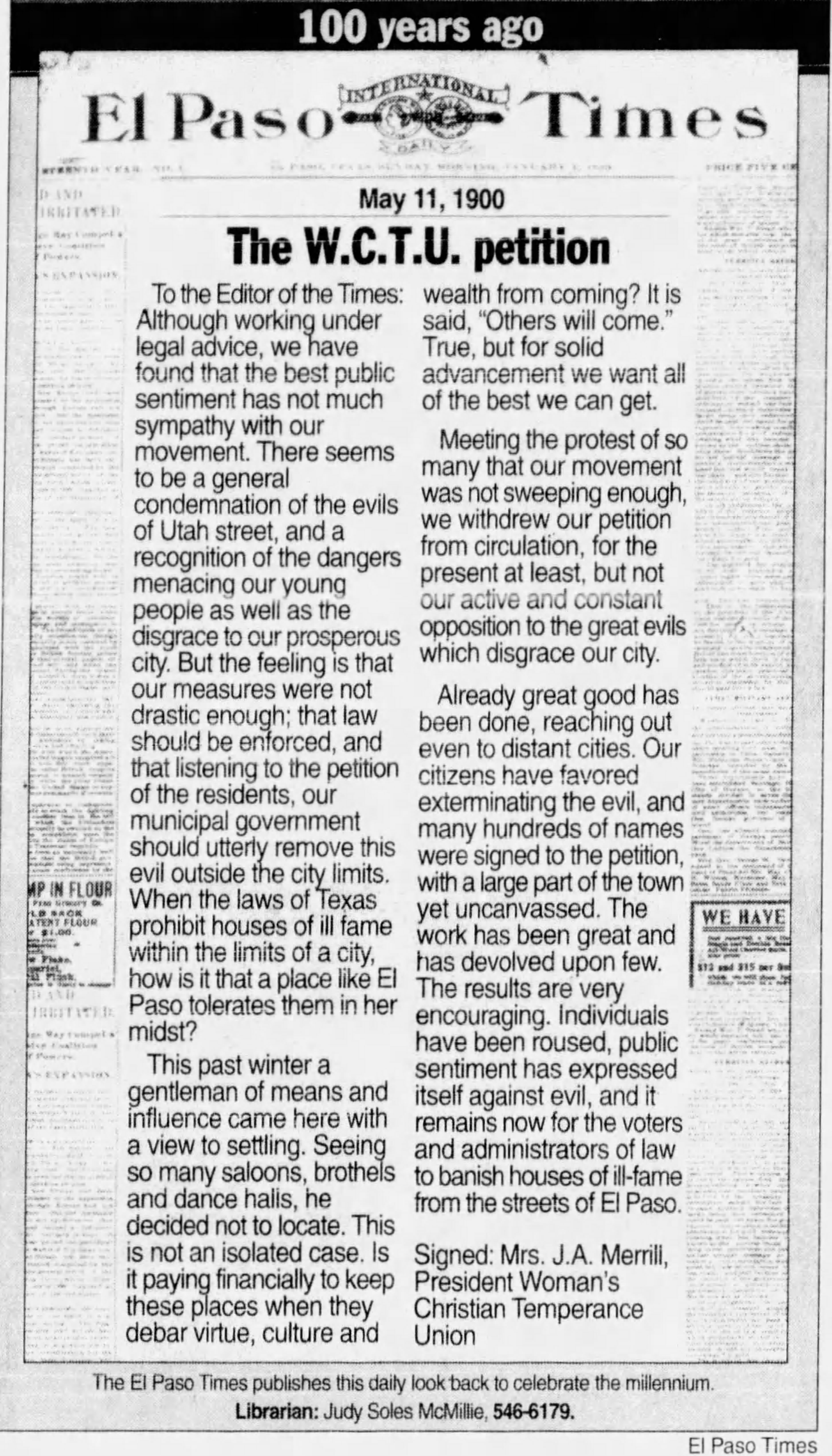 - The Women’s Temperance (WCTU) The W.C.T.U. was organized in 1890, but was reorganized in 1898 by the state president, Helen Stoddard. They fought for prohibition and against other vices. The El Paso Chapter also did a lot of volunteer work and raised money for various charities and clinics. The chapter lasted until the 1960s. A leader of the movement, Carrie Nations came to El Paso in 1902.