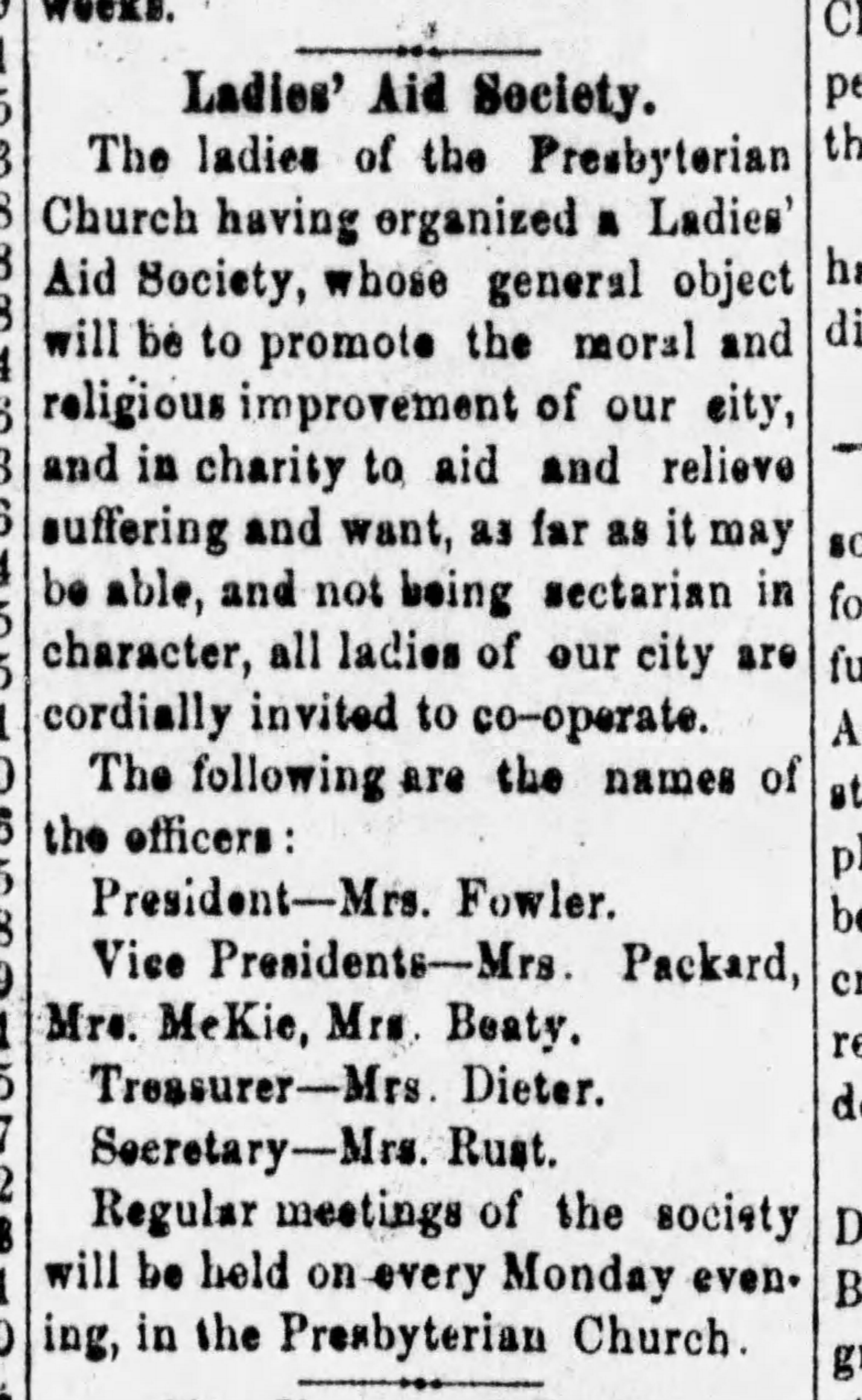 - The Ladies Aid Society of the First Presbyterian Church was one of the earliest and most active ladies aid societies in El Paso. It was formed in 1884. The women of the society opened their meetings to all women of the city. Minna Dieter, wife of a pioneer El Paso businessman, was one of the active members of the society.