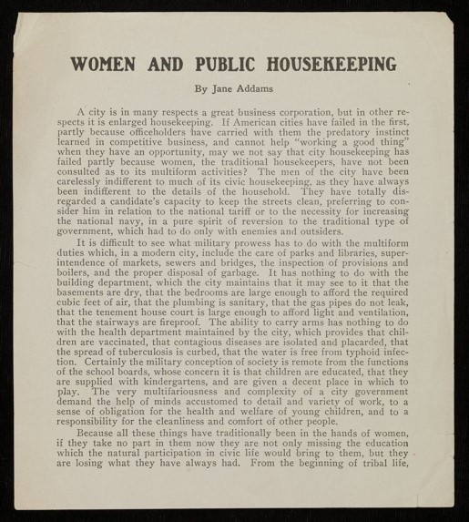 - The term “social housekeeping” was coined famously by suffragist and reformer Jane Addams, who included it in her “Women in Housekeeping “poster published by the National American Women’s Suffrage Association in 1913. The movement connected the image of the woman’s traditional domestic role and connected it to social activism by identifying key reforms and issues that spoke to these women. Ms. Addams came to El Paso to Speak in 1918. Albert and Shirley Small Special Collections Library, University of Virginia. Adams, Jane. Women and Public Housekeeping, 1913 .