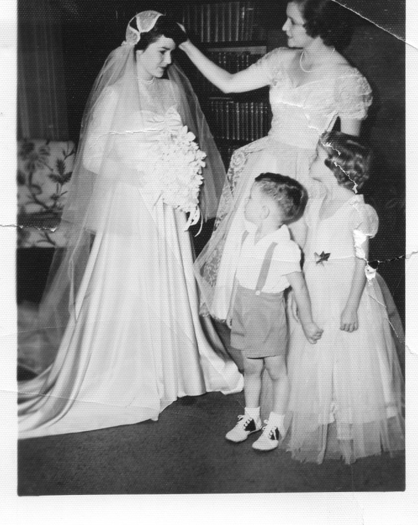 - Anne Perrenot’s wedding to Ronald Mangan, Aug. 25, 1951. Mary Austin Perrenot straightens Anne’s veil while children of Mary Austin, Bill and Barbara Hooten watch. Perrenot-Burges collection