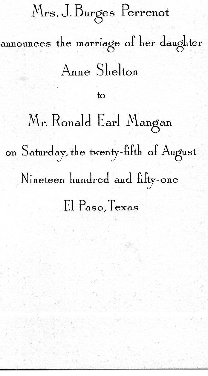 - Mrs. Perrenot’s announcement of Anne Shelton Perrenot’s marriage to Ronald Mangan Aug. 25, 1951. Perrenot-Burges collection
