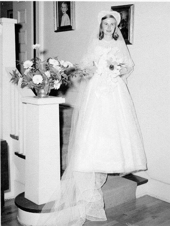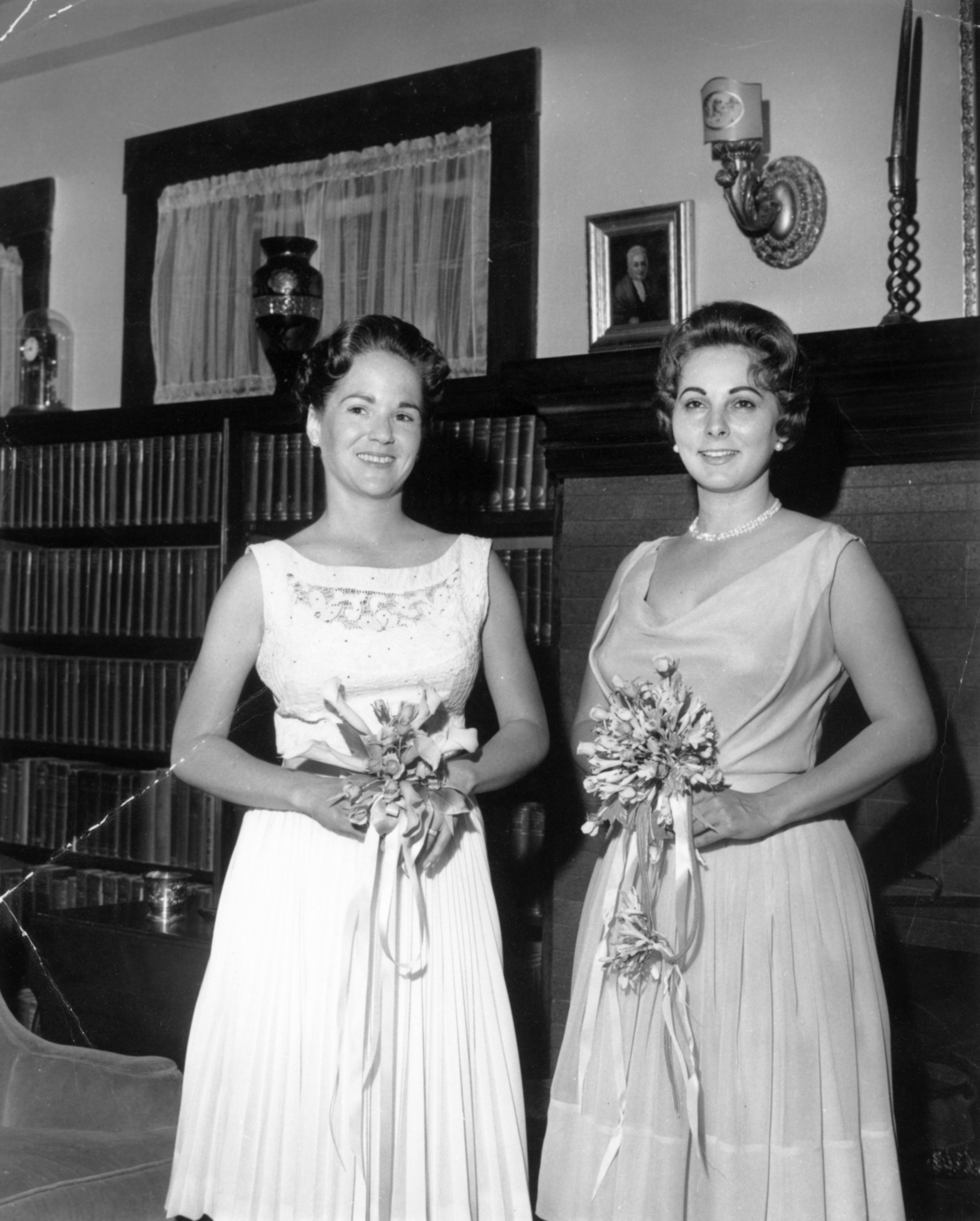 - Copy of photo of attendant Anne Perrenot Mangan and bride Josephine Perrenot on her wedding day in living room of Burges house June 1962..