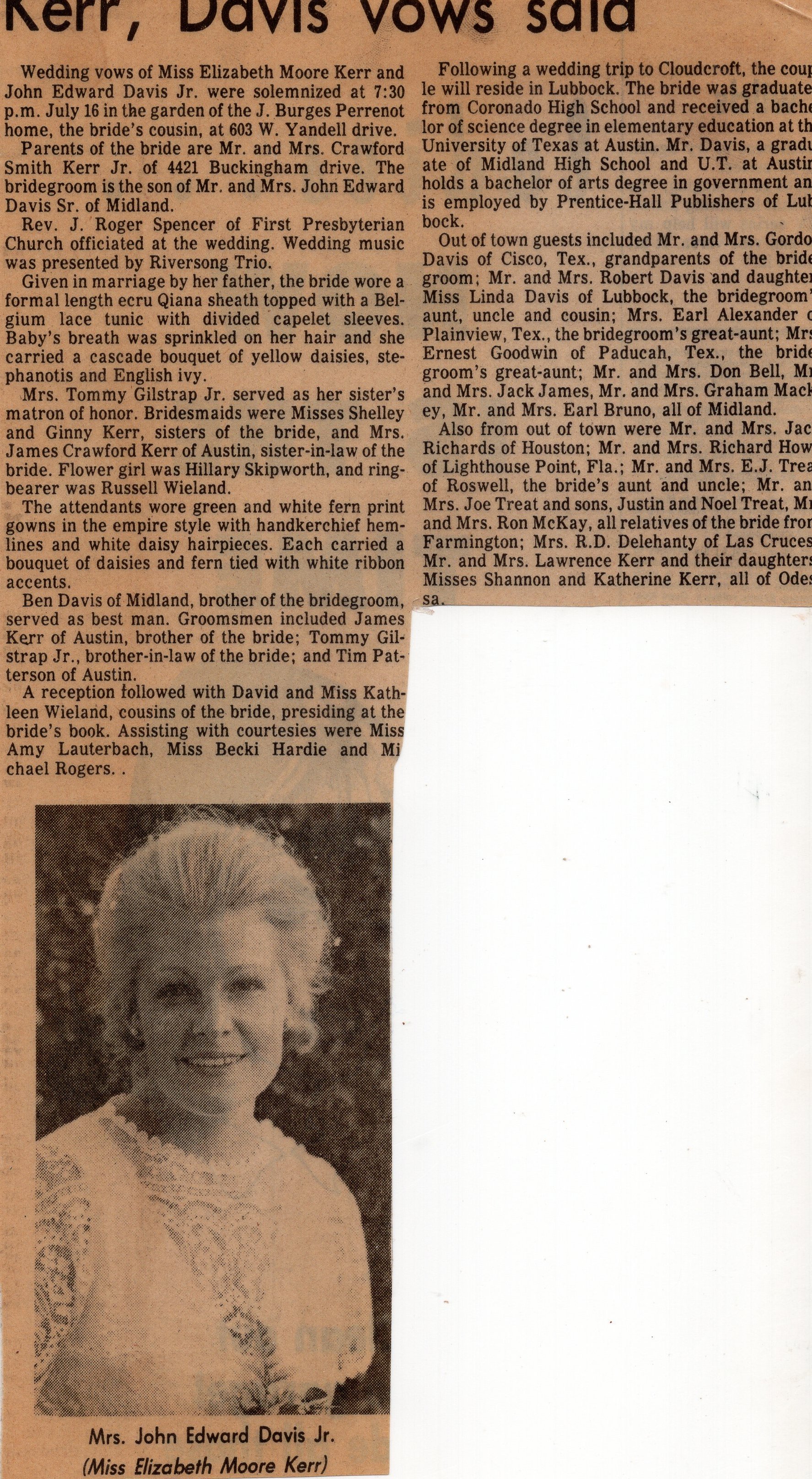 - Newspaper clipping of wedding of Elizabeth Moore Kerr and John Edward Davis,Jr July 16, 1977 at the Burges House.