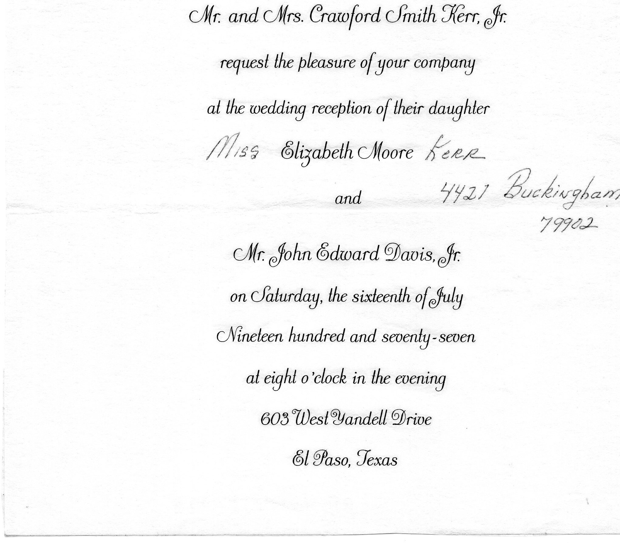 - Invitation to wedding of Elizabeth Moore Kerr to John Edward Davis, Jr. July 16, 1977 at the Burges House.