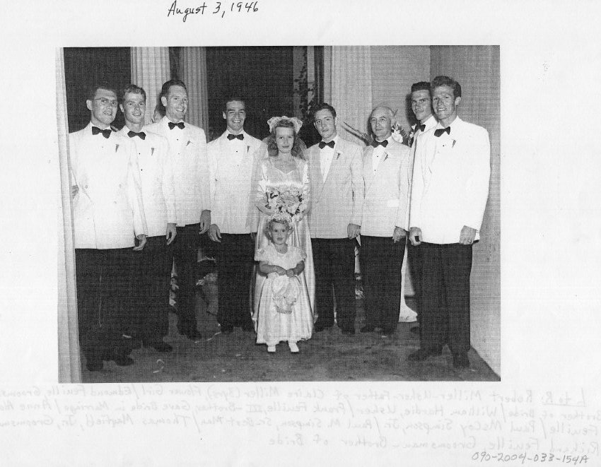 - Copy of wedding photo of Aug. 3, 1946 at Burges house of L to R: Robert Miller, Edmond Feuille groom, Wm.Hardie, Frank Feuille,III, Ann Feuille, Paul Simpson,Jr., Paul M. Simpson,Sr, Thomas Mayfield, Richard Feuille, Claire Miller flower girl.