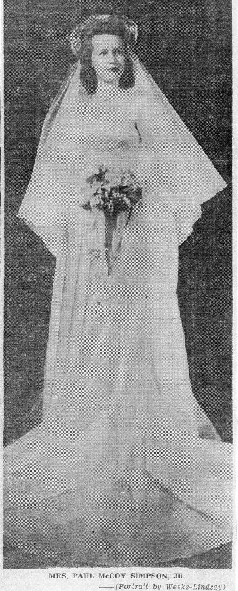 - Copy of Newspaper photo of bride Mrs. Paul McCoy Simpson, Jr. nee Ann Feuille.