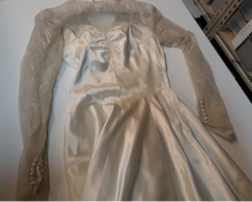 - Wedding Dress belonging to Mary Austin Burges(Frasier) when she married William P. Hooten on Sep,11,1945 at the Burges House.The Dress was donated by her niece, Leigh Aldaco.