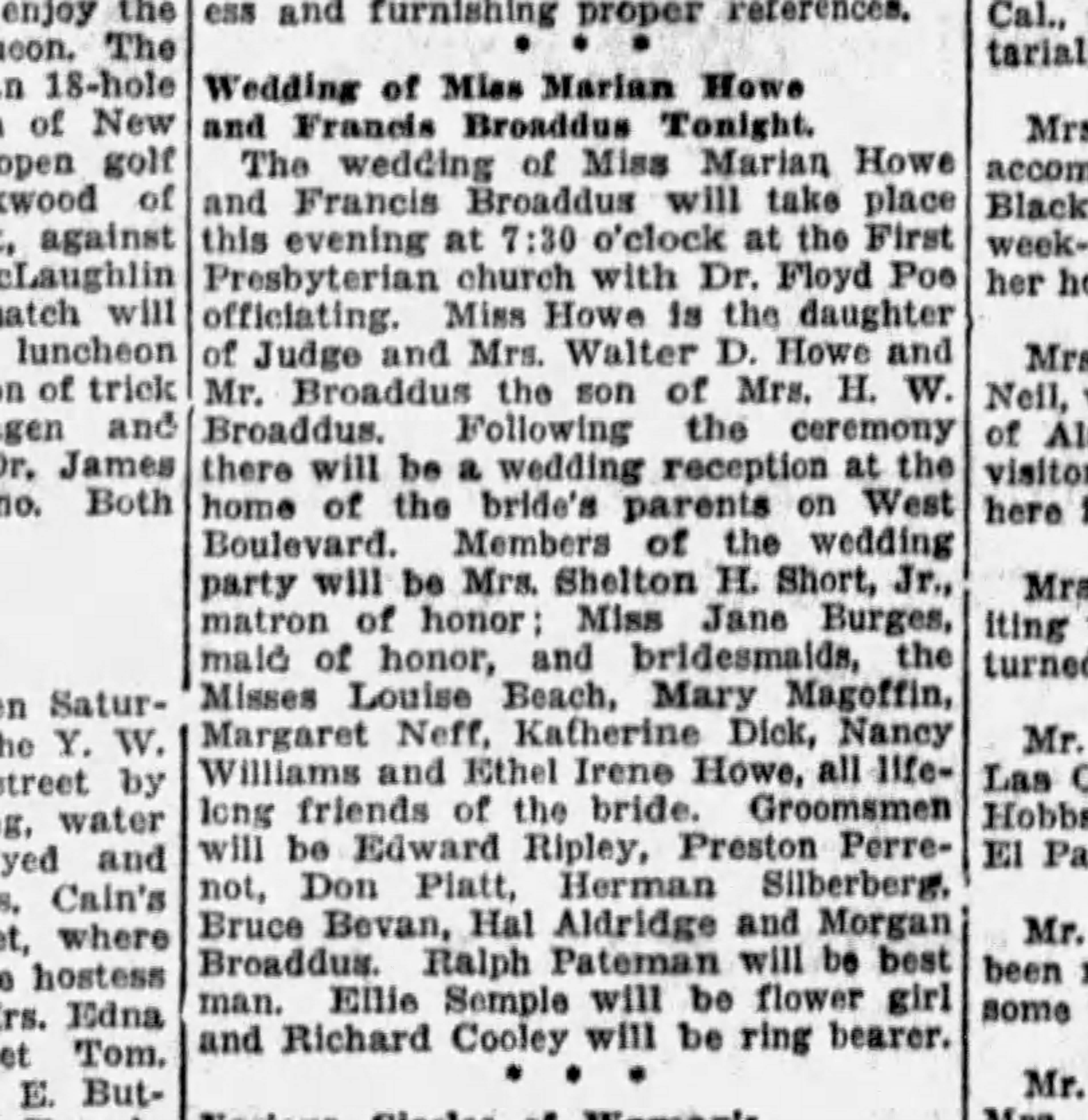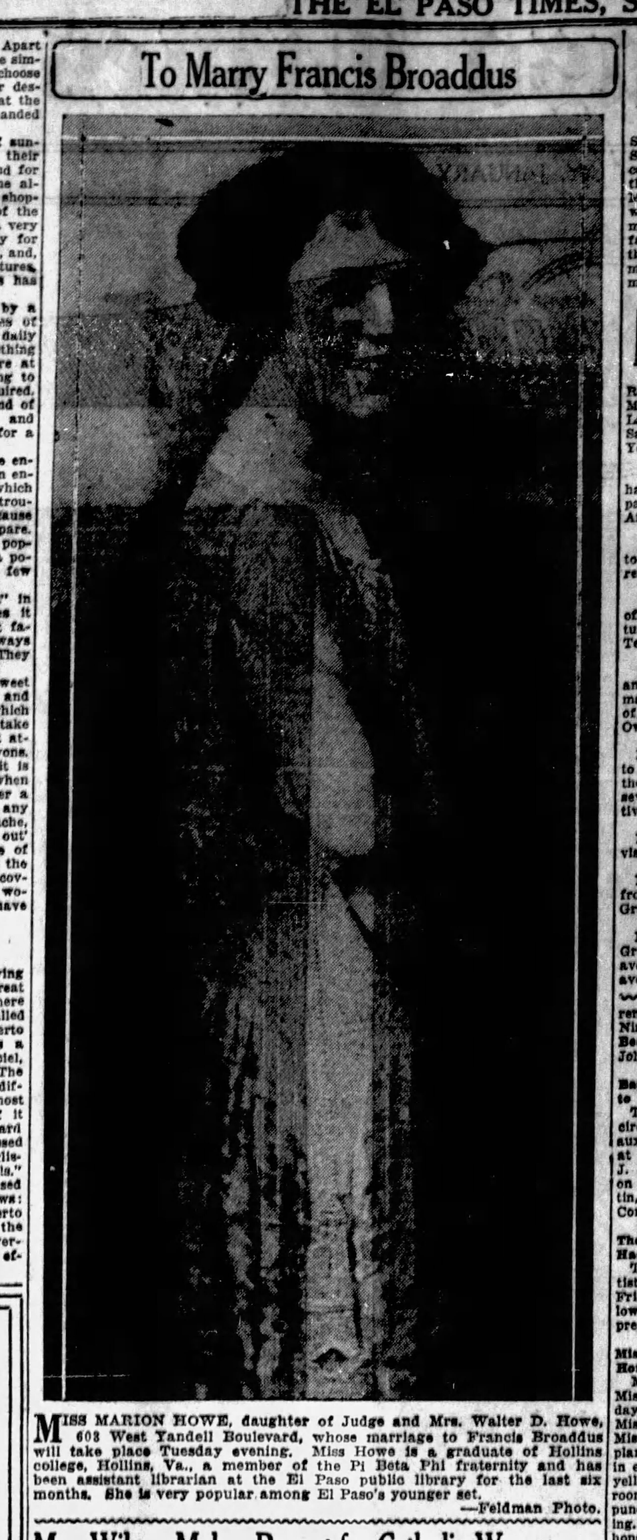 - Marian Howe engagement to Francis Broaddus annoucement. Jan 21, 1923 El Paso Times