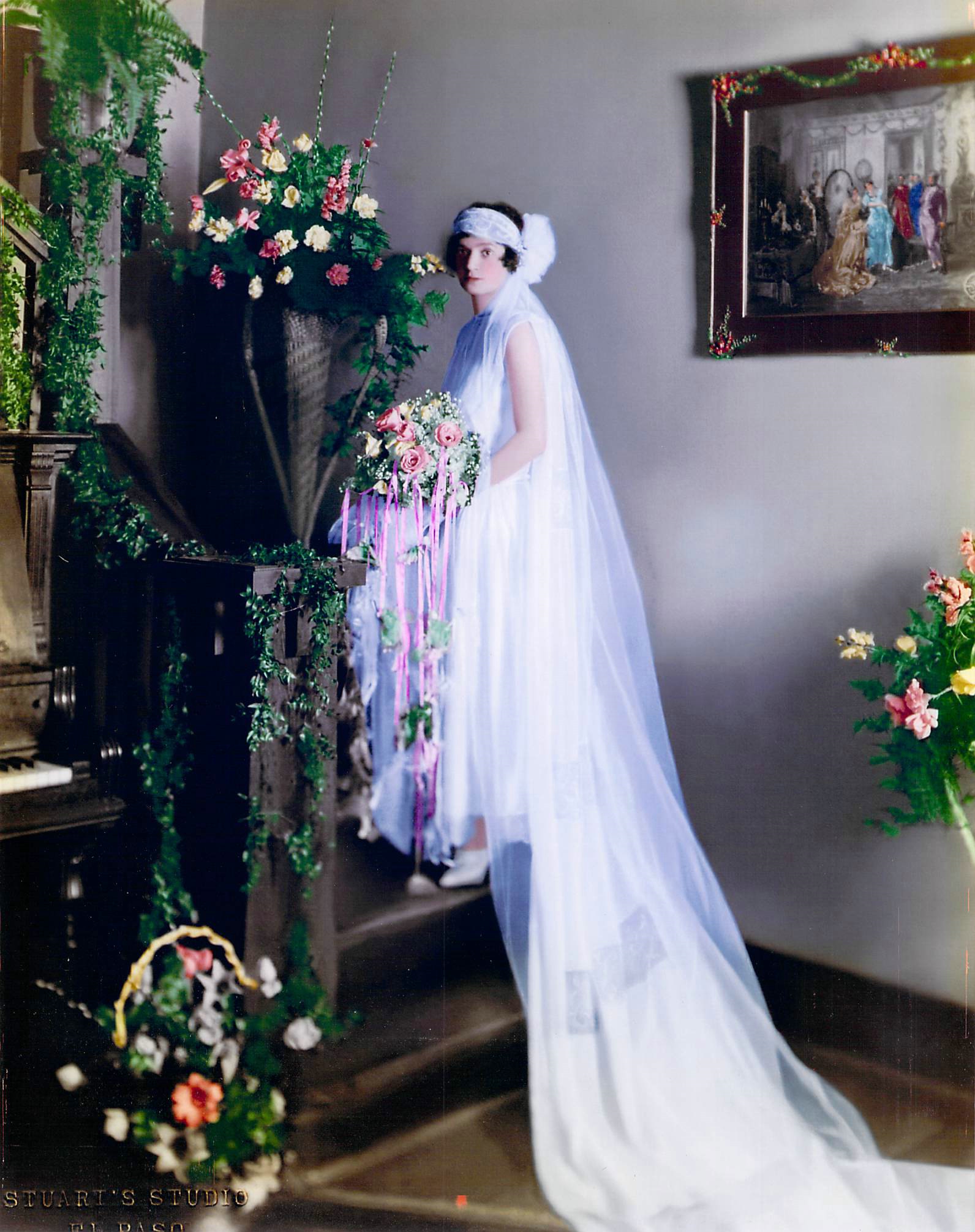 Only relatives and the closest friends of the couple were present. The reception rooms made a pretty setting for the ceremony with decorations of palms, smilax and ferns, and baskets of white blossoms … just before the ceremony the bride’s aunt, Mrs. Walter D. Howe, sang “Because” accompanied by Mrs. William R. Brown at the piano . . . . The wedding march from Lohengrin was played by Mrs. Brown as the wedding party came down the stairway and through the aisle of white satin ribbons and white tulle …. Dr. Floyd Poe [who] officiated … awaited at the improvised altar at … awaited at the improvised altar at the end of the drawing-room . . . . The bride came to the altar with her father, Maj. Richard Fenner Burges, who gave her in marriage …. She was gowned in ivory Chantilly lace and chiffon designed over crepe satin of the palest shade of shell pink. The bodice was in long waist effect and the skirt inset with lace. The train of chiffon was inset with lace and the veil was of tulle and lace. The veil was worn in band effect across the brow and caught in loops at the back of the head …. She carried a bouquet of brides roses, weed peas, pink roses and lilies of the valley . . . . Immediately after the ceremony a reception was given for a large number of guests . . . . Salad and ices were served and the table in the dining room centered with the wedding cake was covered with a lace cloth lighted with white candles and white tulle added further to the dainty effect.